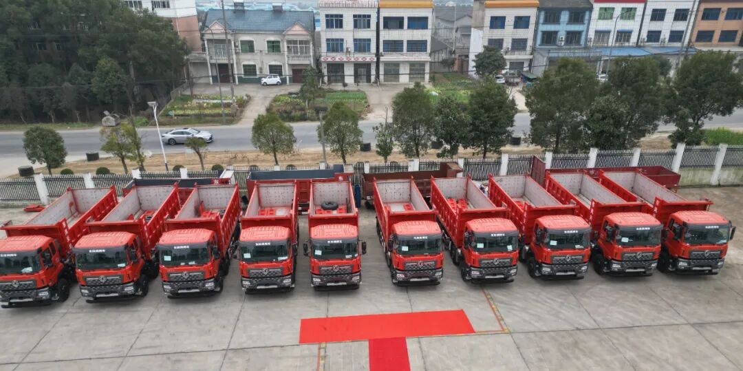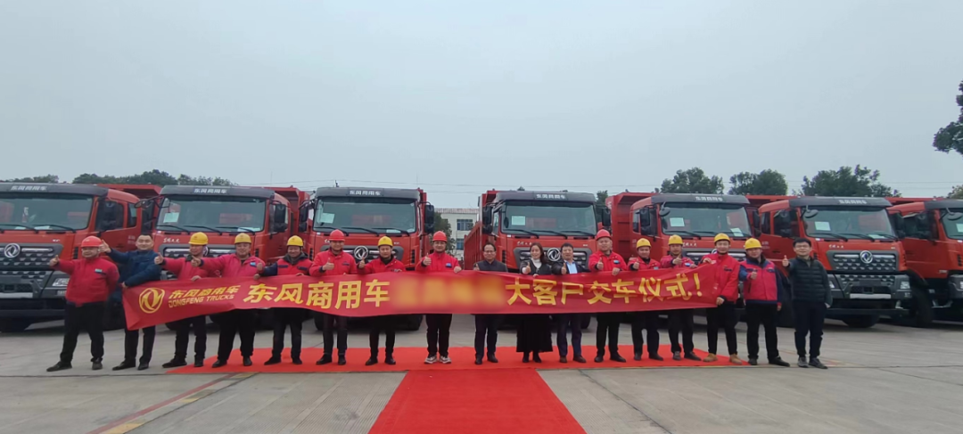 在湖北宜昌,东风商用车将20辆东风天龙KC工程车交付给一家矿石运输公司。
