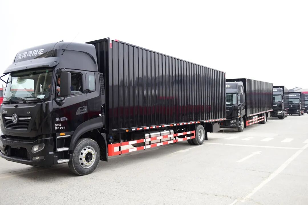 在河南商丘,东风商用车将30辆东风天锦KR厢式车交付给一家快递物流公司。