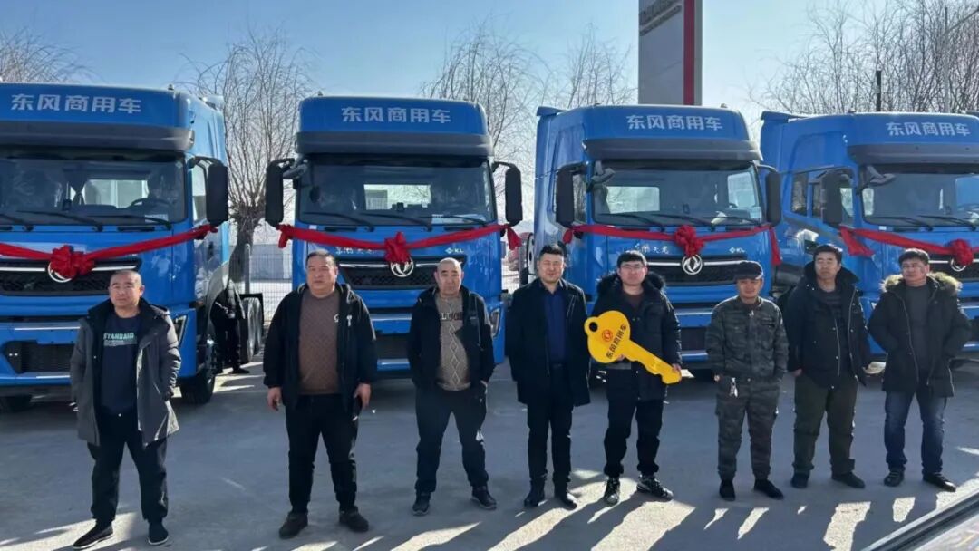 在辽宁鞍山,10辆搭载龙擎动力的480马力东风天龙KL燃气牵引车交付客户。