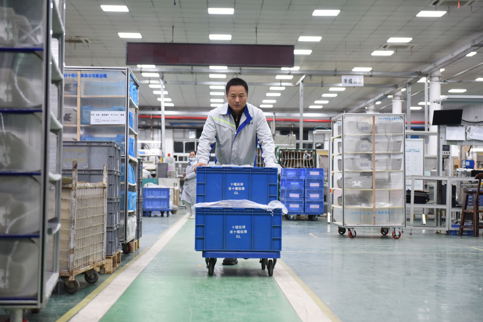 “李卫国!来拉货!”晚上9时许,遮阳板区域装配线边,检查员刚刚检查完装配好的一批遮阳板,就大声呼喊物流员李卫国。李卫国是遮阳板区域“最受欢迎”的员工,加工之前的物料,加工之后的产品,都由他负责运送,为了节省时间,每次他都是小跑着来回。