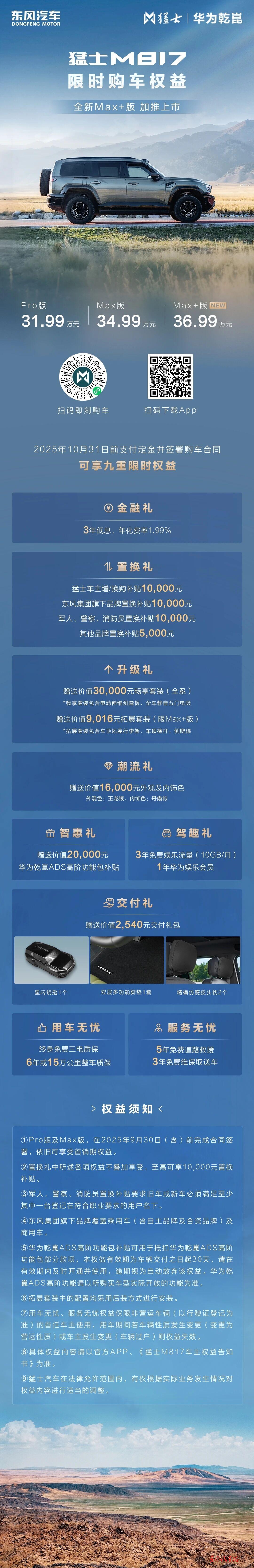 【东风汽车报武汉讯】 9月29日,猛士科技与华为联手打造的豪华智能越野SUV猛士M817长续航新成员——猛士M817 Max+版正式上市,官方指导价36.99万元。消费者10月31日前支付定金并签署购车合同,可享九重限时权益,轻松开启全域智野新体验。