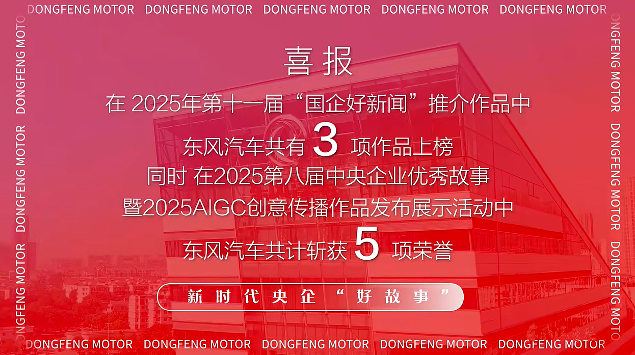 【东风汽车报讯】 近日,第十一届“国企好新闻”推介作品名单正式揭晓,东风汽车3项作品上榜。同时,在第八届中央企业优秀故事暨2025 AIGC创意传播作品发布展示活动中,东风汽车斩获5项荣誉。