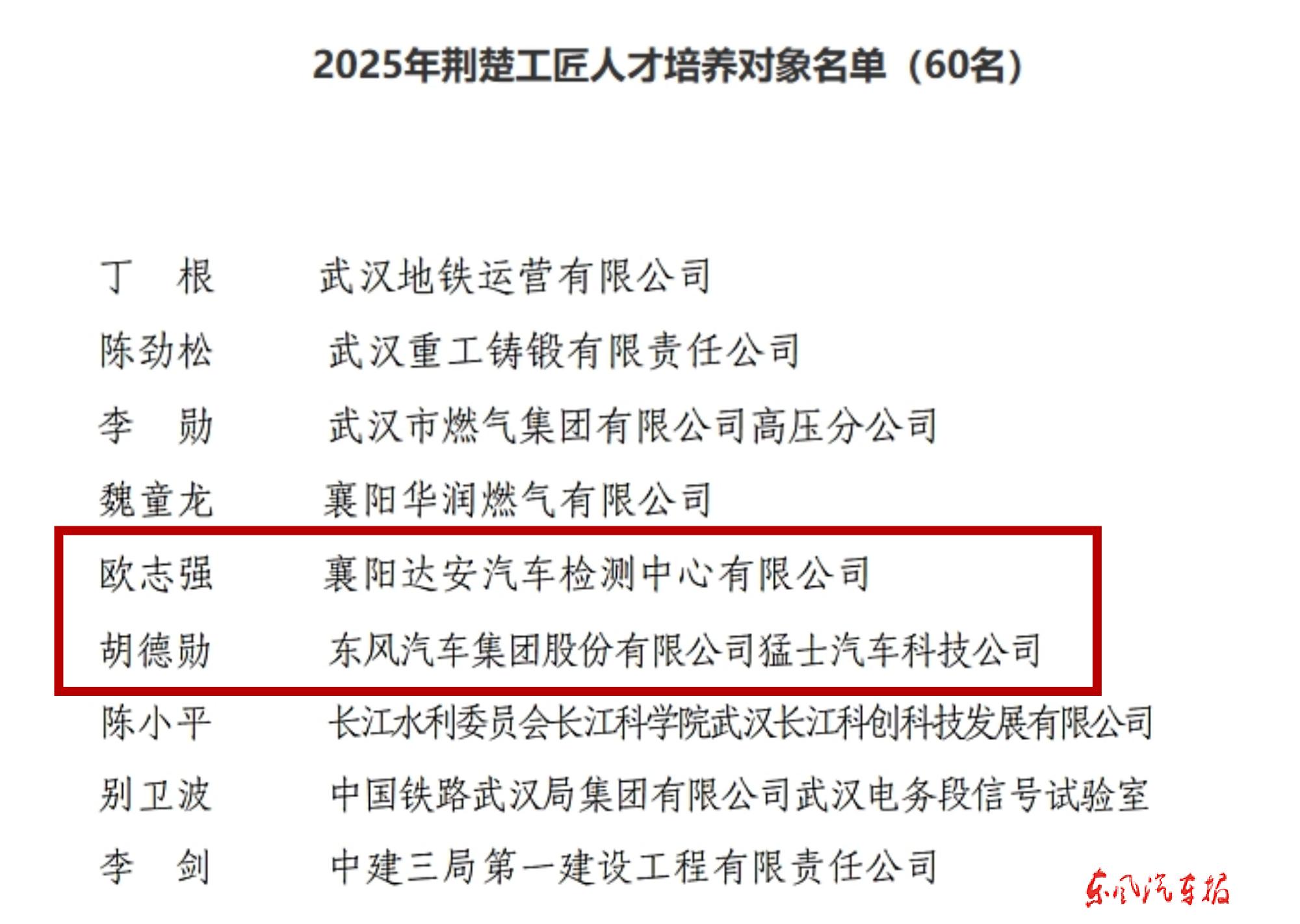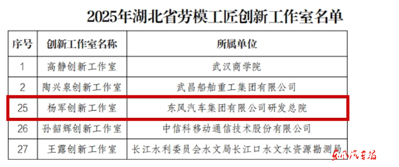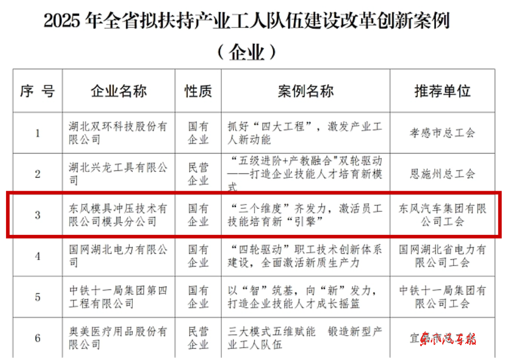 公司工会系统近日还获得多项省级荣誉。东风汽车杨军创新工作室获“2025年湖北省劳模工匠创新工作室”认定,东风模具冲压技术有限公司模具分公司《“三个维度”齐发力,激活员工技能培育新“引擎”》案例、襄阳达安汽车检测中心有限公司新能源动力班组《传承匠人匠心,建设新时代“一专多能人才超市”》案例进入2025年湖北省拟扶持产业工人队伍建设改革创新案例名单,襄阳达安汽车检测中心有限公司员工欧志强、猛士科技员工胡德勋成为“2025年荆楚工匠人才培养对象”。